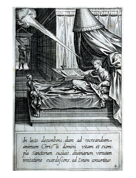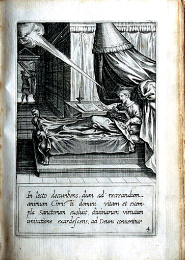 Zentrale Stationen des Lebensweges Ignatius von Loyolas, dem Begründer des Jesuitenordens, sollten in der Gemeinde sichtbar gemacht und zu Bewusstsein gebracht werden. Dazu wurden Reproaufnahmen von Druckgraphiken aus einem antiquarischen Buch über das Leben und Wirken des Heiligen angefertigt, um sie anschließend (vergrößert) in einer Ausstellung zu präsentieren. Die Publikation gehört zum Bestand der Bibliothek der Philosophisch-Theologischen Hochschule St. Georgen zu Frankfurt am Main, die sie freundlicherweise zur Verfügung stellte. // Elementary situations and acts of life and works of Ignatious of Loyola, founder of the Society of Jesus, should be made visible and brought into consciousness to the members of the catholic parish of the university. Fore that photographs were taken from graphic reproductions from an old-fashioned book about the saint. The photographs were – in an bigger seize – part of an exhibition. The book belongs to the library of the Theological-Philosophical Academy St. Georgen in Frankfurt/Main and was kindly made available for use.